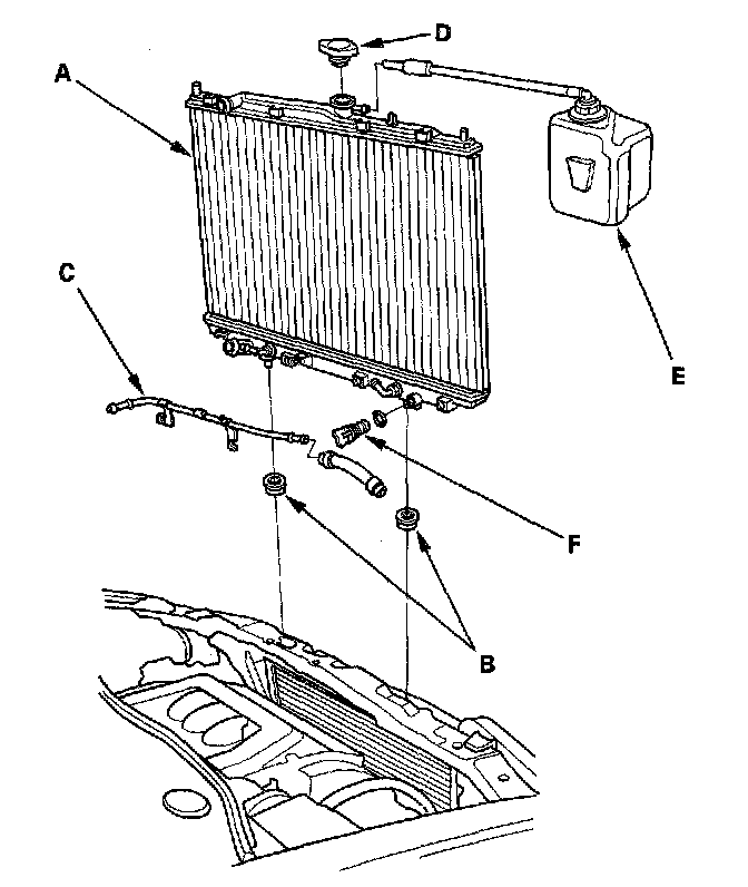 16. Pull up the radiator (A), then remove the lower cushions (B), ATF cooler line (C), radiator cap (D), reservoir tank (E) and drain plug (F).