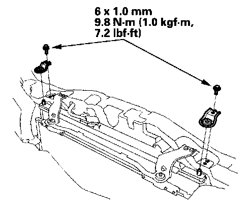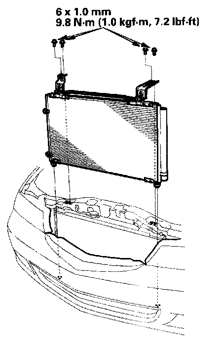 5. Remove the bolts, then remove the condenser by lifting it up. Be careful not to damage the radiator or the condenser fins when removing the condenser.