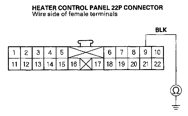 7. Check for continuity between the No.9 terminal of the heater control panel 22P connector and body ground.