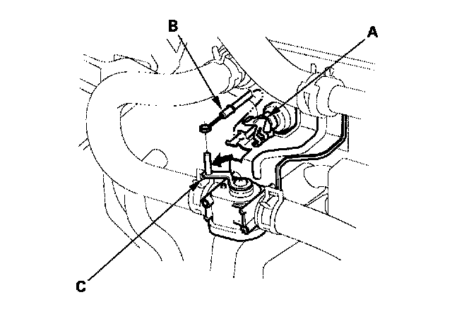 3. From under the hood, open the cable clamp (A), then disconnect the heater valve cable (B) from the heater valve arm (C). Turn the heater valve arm to the fully opened position as shown.