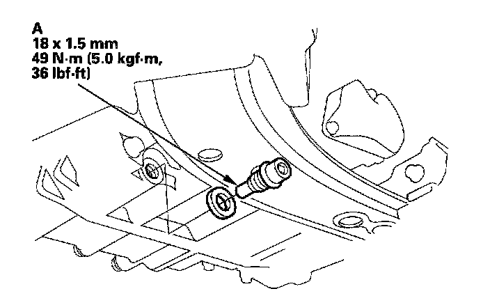 3. Remove the ATF filler bolt and the drain plug (A), and drain the Automatic Transmission Fluid (ATF).