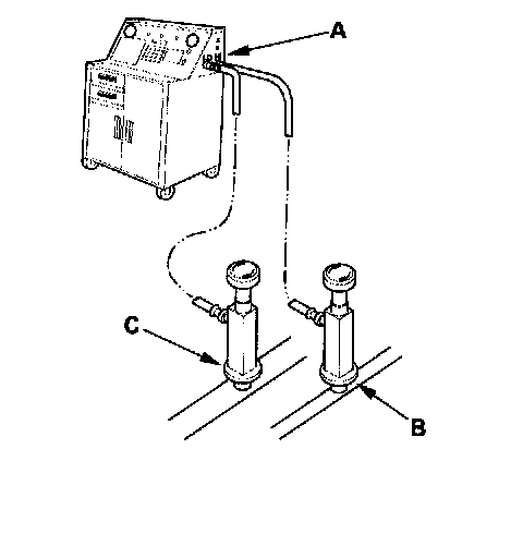 1. Connect a R-134a refrigerant recovery/recycling/charging station (A) to the high-pressure service port (B) and the low-pressure service port (C), as shown in the previous column, following the equipment manufacturer's instructions.