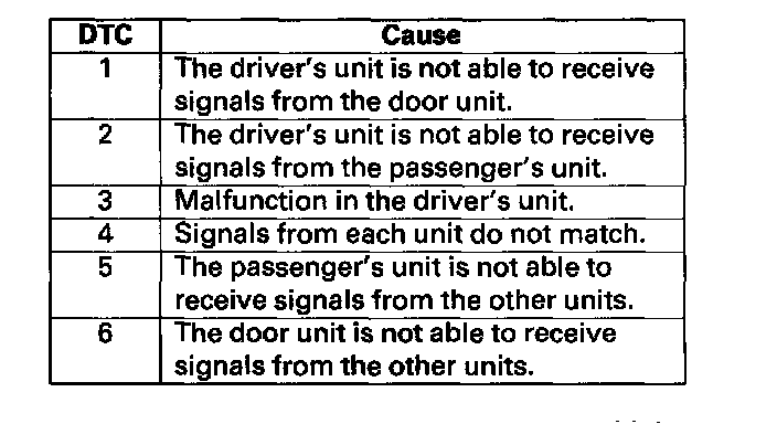 6. One second after you go into self-diagnosis mode 1, the ignition key light and beeper indicate the DTC, and repeat it every three seconds. If there is more than one DTC, the system will indicate them in ascending order, beginning from the DTC with the lowest numerical value. Find your DTC in this table, then go to step 8 and check the communication lines.