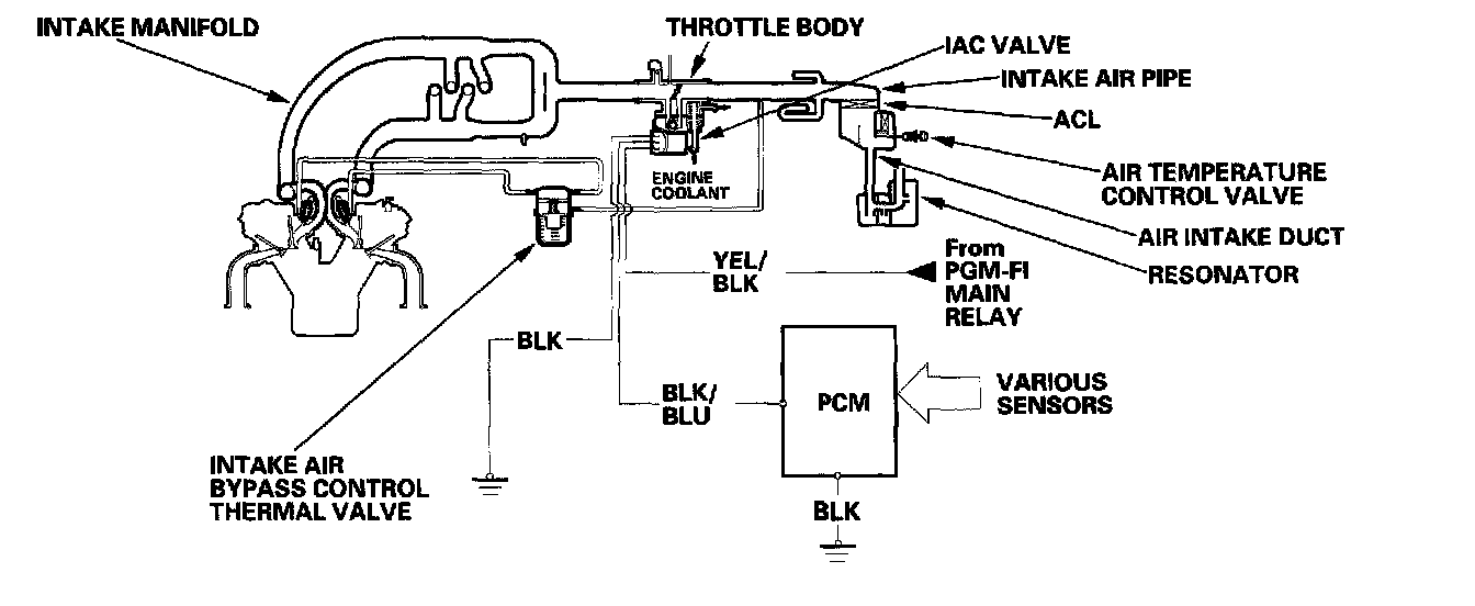 When the engine is running, the intake air bypass control thermal valve sends air to the injectors.