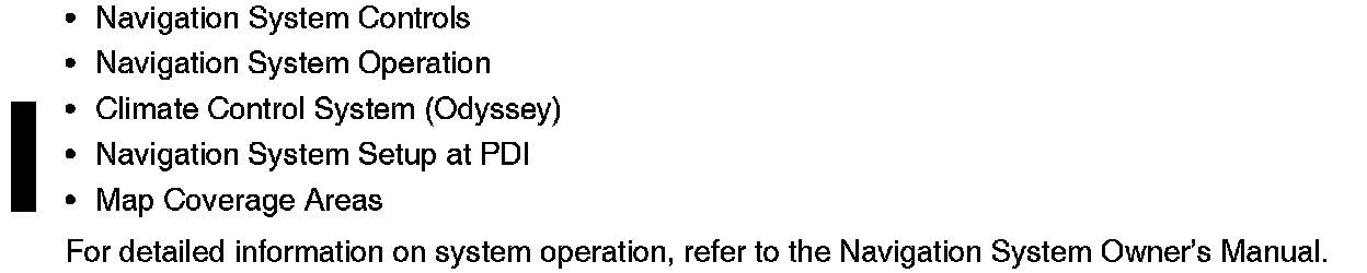 This bulletin provides information for Pre-Delivery Inspection (PDI) of the Navigation System. The topics shown are covered.