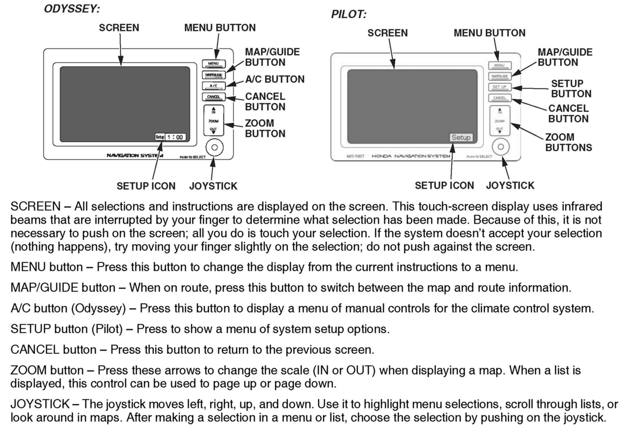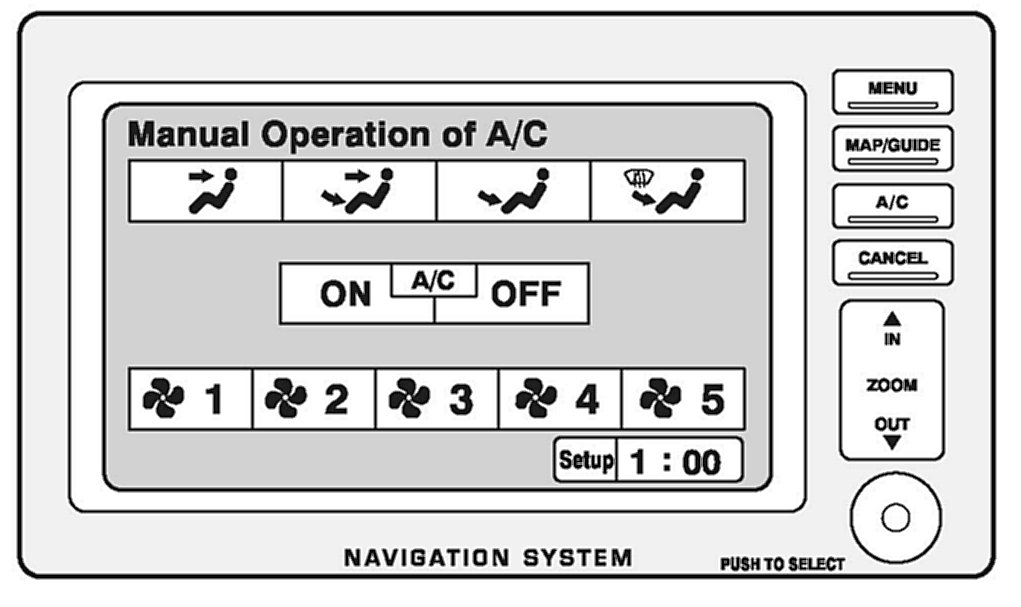Pressing the A/C button on the navigation system control panel brings up the A/C manual operation display. Climate control settings can then be changed by touching the desired setting or by using the joystick. Refer to the vehicle Owner's Manual for specific operating instructions.
