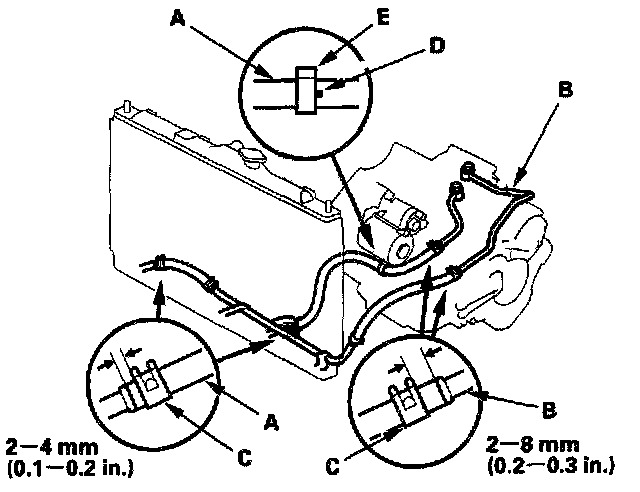 Connect the cooler hoses (A) to the lines (B) and the ATF cooler, and secure them with the clips (C).