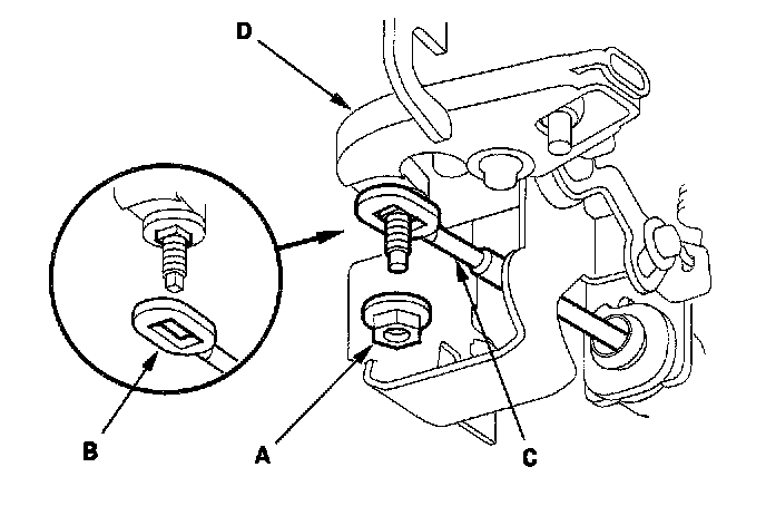 3. Remove the nut (A) securing the shift cable end (B), then separate the shift cable (C) from the shift lever assembly (D).