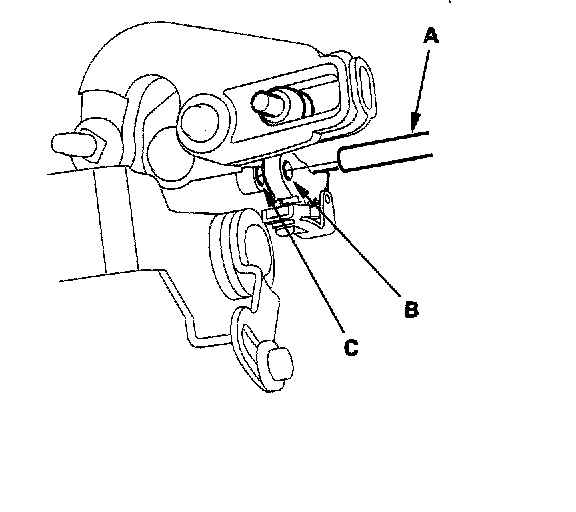 10. Insert a 6.0 mm (0.24 inch) pin (A) through the positioning hole (B) on the detent plate and into the positioning hole (C) on the control bracket.