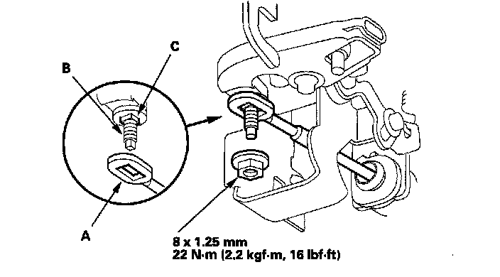 11. Install the shift cable end (A) to the mounting stud (B) by aligning its flat surfaces with the square shape (C) at the bottom of the stud.
