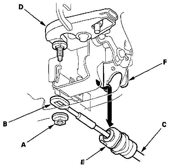 6. Rotate the socket holder (E) on the shift cable counterclockwise a quarter turn, then slide the holder to remove the shift cable from the shift cable bracket (F).