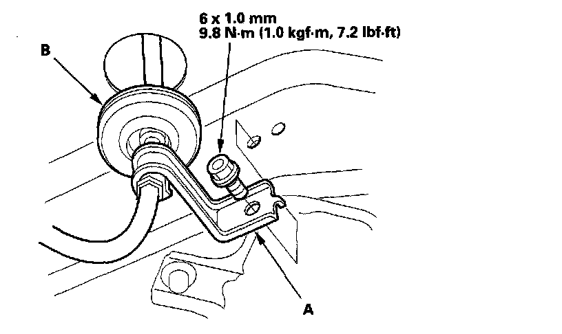 7. Remove the shift cable guide bracket (A) and grommet (B).
