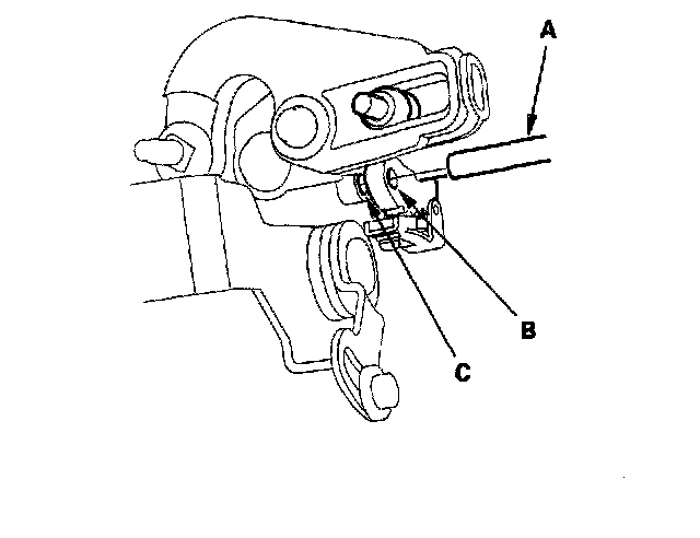 18. Insert a 6.0 mm (0.24 inch) pin (A) through the positioning hole (B) on the detent plate and into the positioning hole (C) on the control bracket.