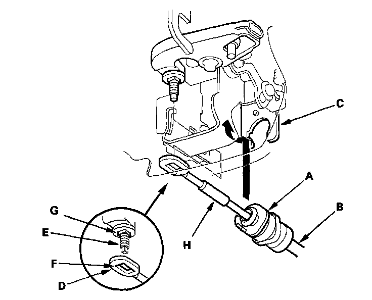 19. Align the socket holder (A) on the shift cable (B) with the slot in the shift cable bracket (C), then slide the holder into the bracket. Install the shift cable end (D) over the mounting stud (E) by aligning its square hole (F) with the square fitting (G) at the bottom of the stud, and rotate the holder clockwise a quarter turn to secure the shift cable.
