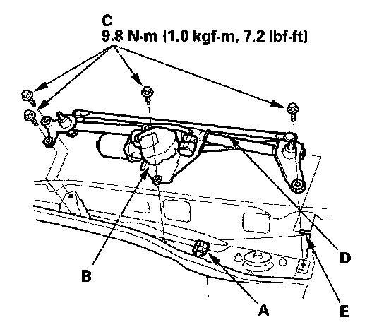 4. Remove the bolts (C), move windshield wiper linkage assembly (D) toward the passenger's side of the vehicle until it slides off of the pin (E), then remove the assembly.