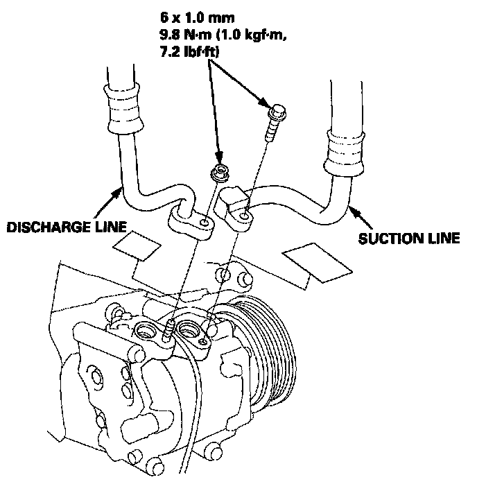 7. Remove the nut and bolt, then disconnect the suction and discharge lines from the compressor.