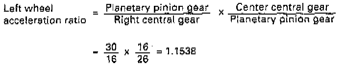 - When the planetary pinion shaft makes one full turn, the planetary pinion gear turns around the led central gear at a ratio of 32/28. It also turns around the center central gear at a ratio of 16/30. Therefore, the following formula shows that the rotation speed of the right central gear increases at a ratio of approximately 1.15.