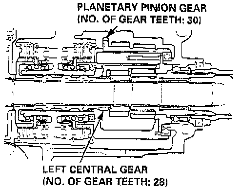 - The planetary pinion gears, center central gear, right central gear, and left central gear engage each other and rotate as an assembly. Therefore, there is no difference in acceleration between the right and left wheels.