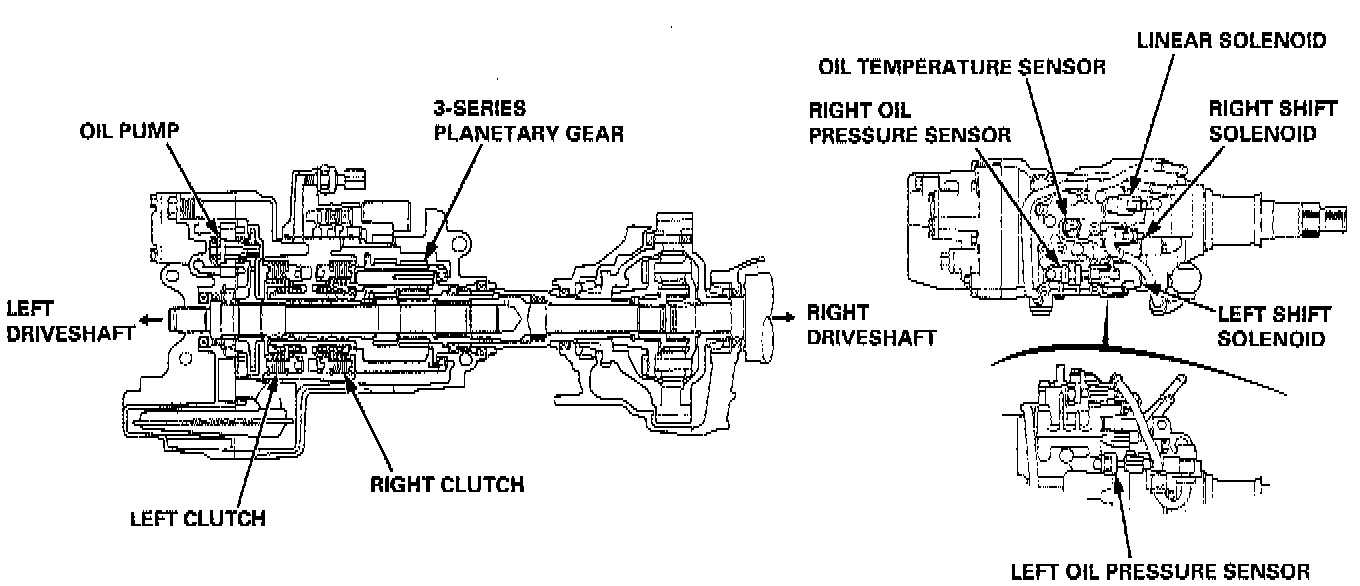 The right and left oil pressure sensors are in the right and left clutch oil lines. After detecting the oil pressure, the sensors transmit the signal to the ATTS control unit.