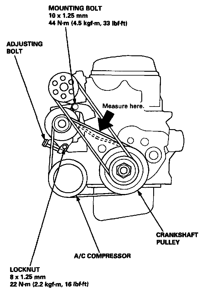 Apply a force of 98 N (10 kgf, 22 lbf), and measure the deflection between the alternator and crankshaft pulley.