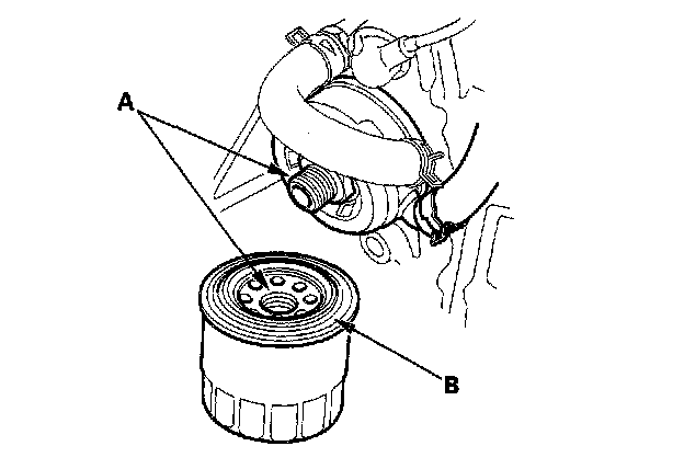 2. Inspect the threads (A) and rubber seal (B) on the new filter. Wipe off the seat on the engine block, then apply a light coat of oil to the filter rubber seal. Use only filters with a built-in bypass system.