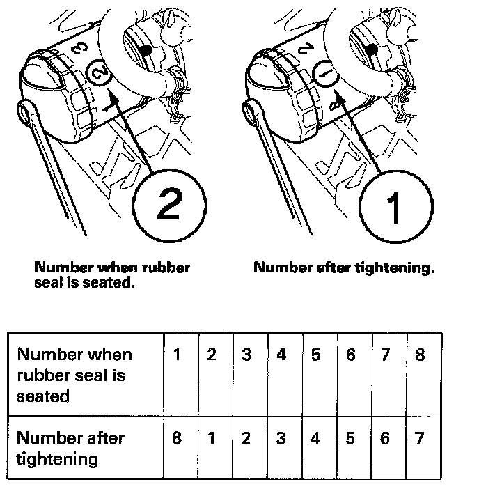 - Tighten the filter by turning it clockwise seven numbers from the one you noted. For example, if number 2 is at the bottom when the seal is seated, tighten the filter until the number 1 comes around the bottom.