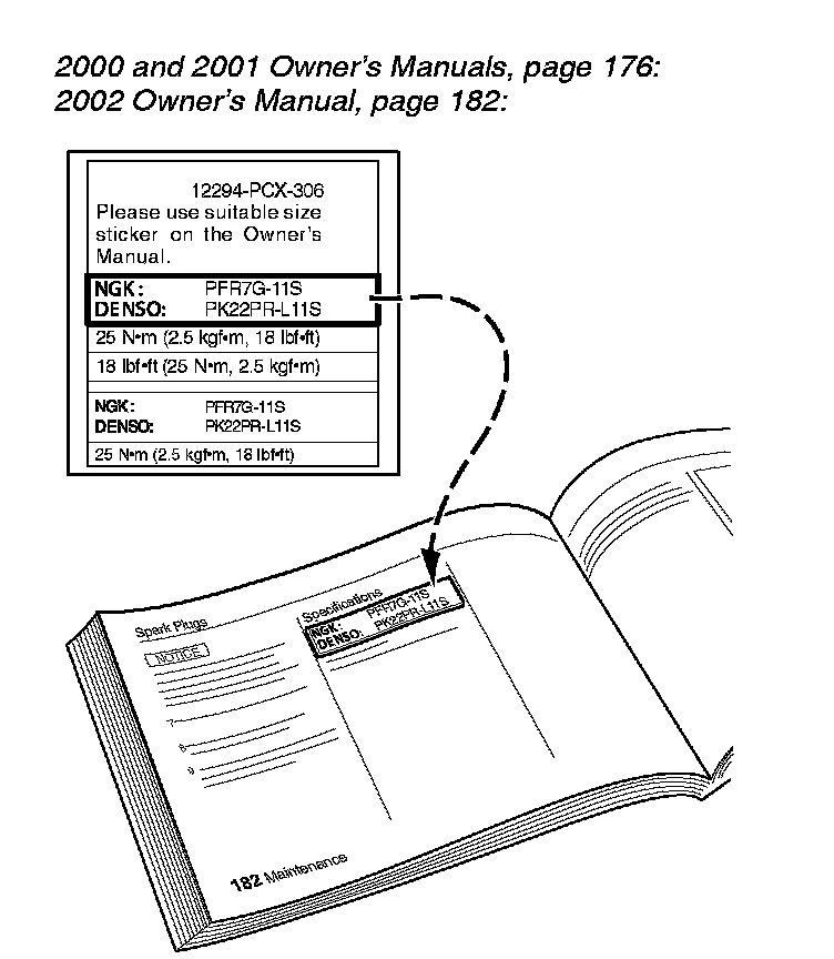Replace the spark plugs. Then, using the correction labels included in the spark plug kit, update the spark plug information in your customer's S2000 Owner's Manual. You should also update your 2000-02 S2000 Service Manual.
