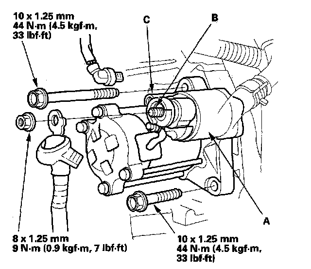 7. Disconnect the starter cable from the B terminal on the starter solenoid (A), then disconnect the BLK/WHT wire from the S terminal (C).