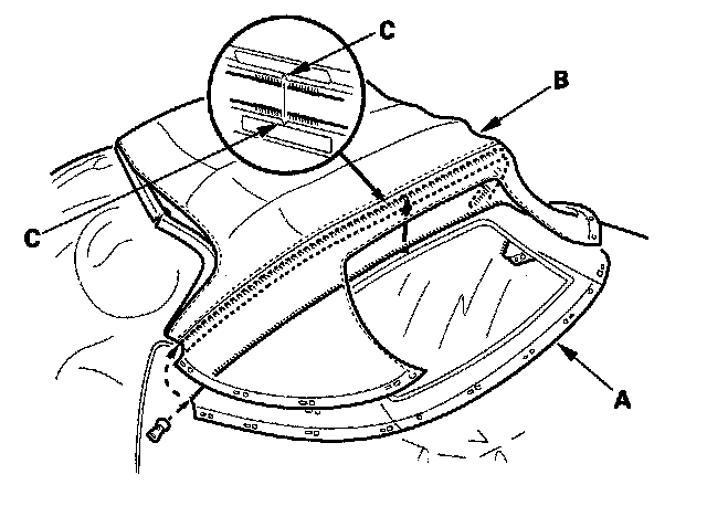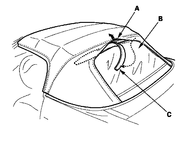 5. Lift the convertible top cloth (A) that overlaps the top of the rear window (B), and remove the patch (C) from the roof zipper.