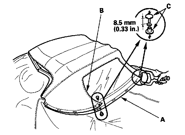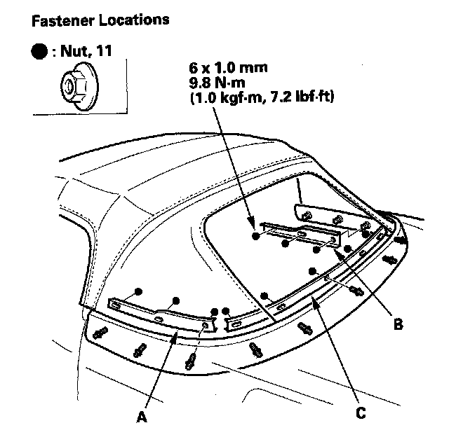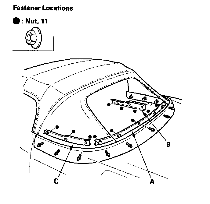 9. Remove the 11 nuts, then remove the rear lower convertible top retainer (A), right side convertible top retainer (B), and left side convertible top retainer (C).