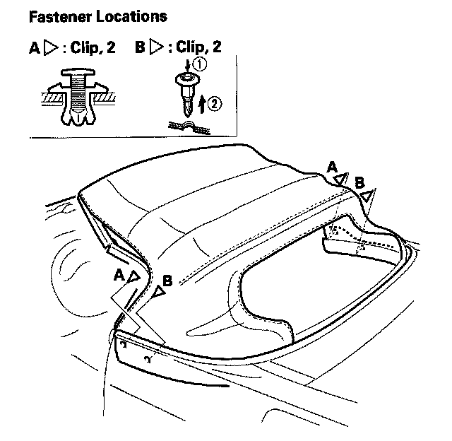 10. Open the roof half-way, and remove the two clips (A, B) on each side of the top between the quarter panel and the roof.