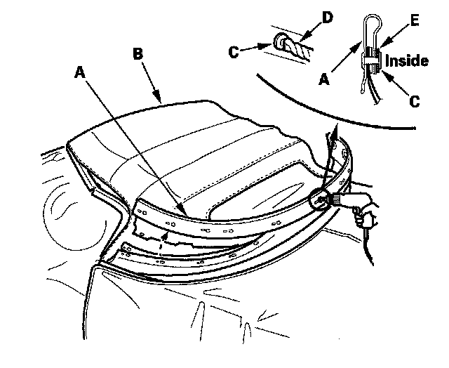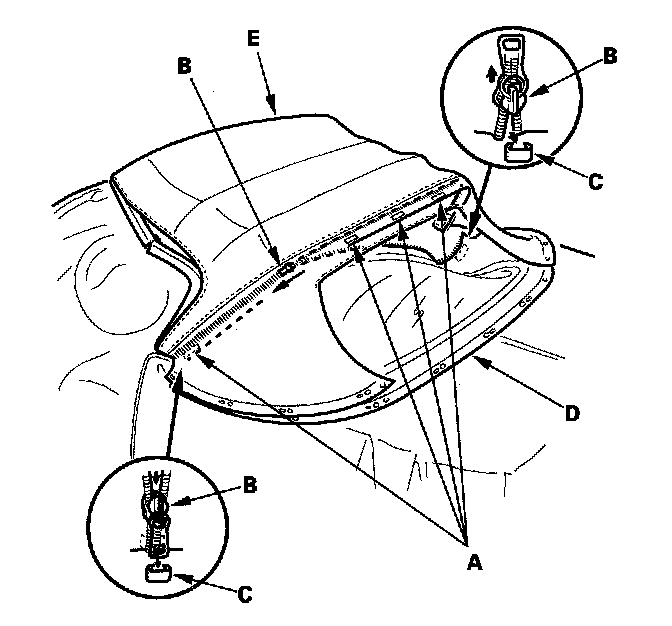 20. Turn the convertible top cloth (A) inside out, and apply a new patch (B) on the zipper (C). Make sure the alignment notches (D) aligns with the middle of the rear window (E).