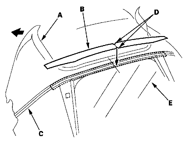 14. Pull the rain rail (A) up, and turn it inside-out. With the rain rail resting on the roof (B), drill out the rivets (C) with a 4 mm (0.16 in.) drill (D). The washers (E) on the rain rail are not reused.