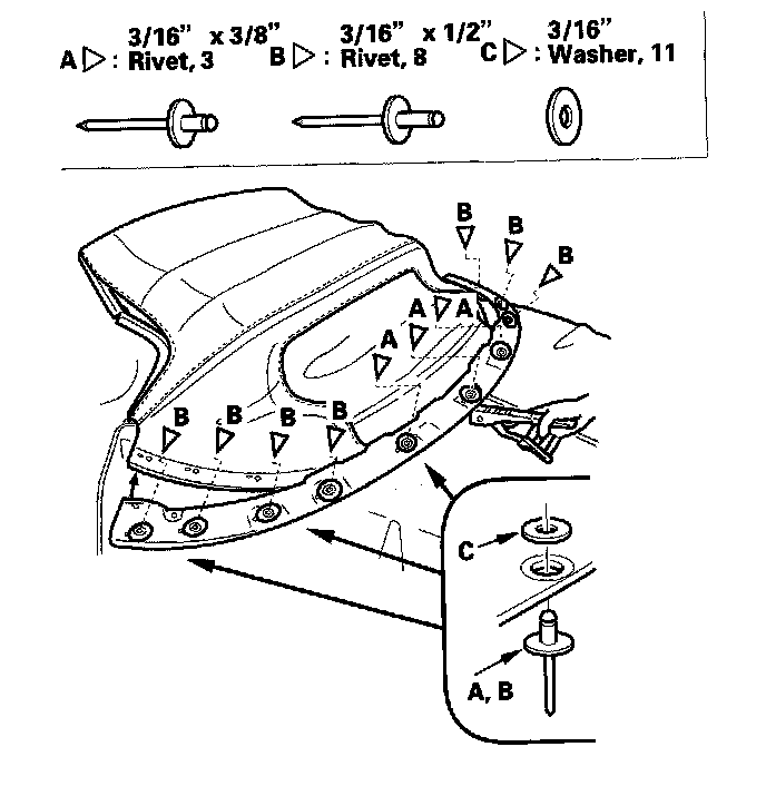 22. Secure the lower part of the rear window (A) to the lower part of the convertible top cloth (B) with new two-piece brass rivets (C).