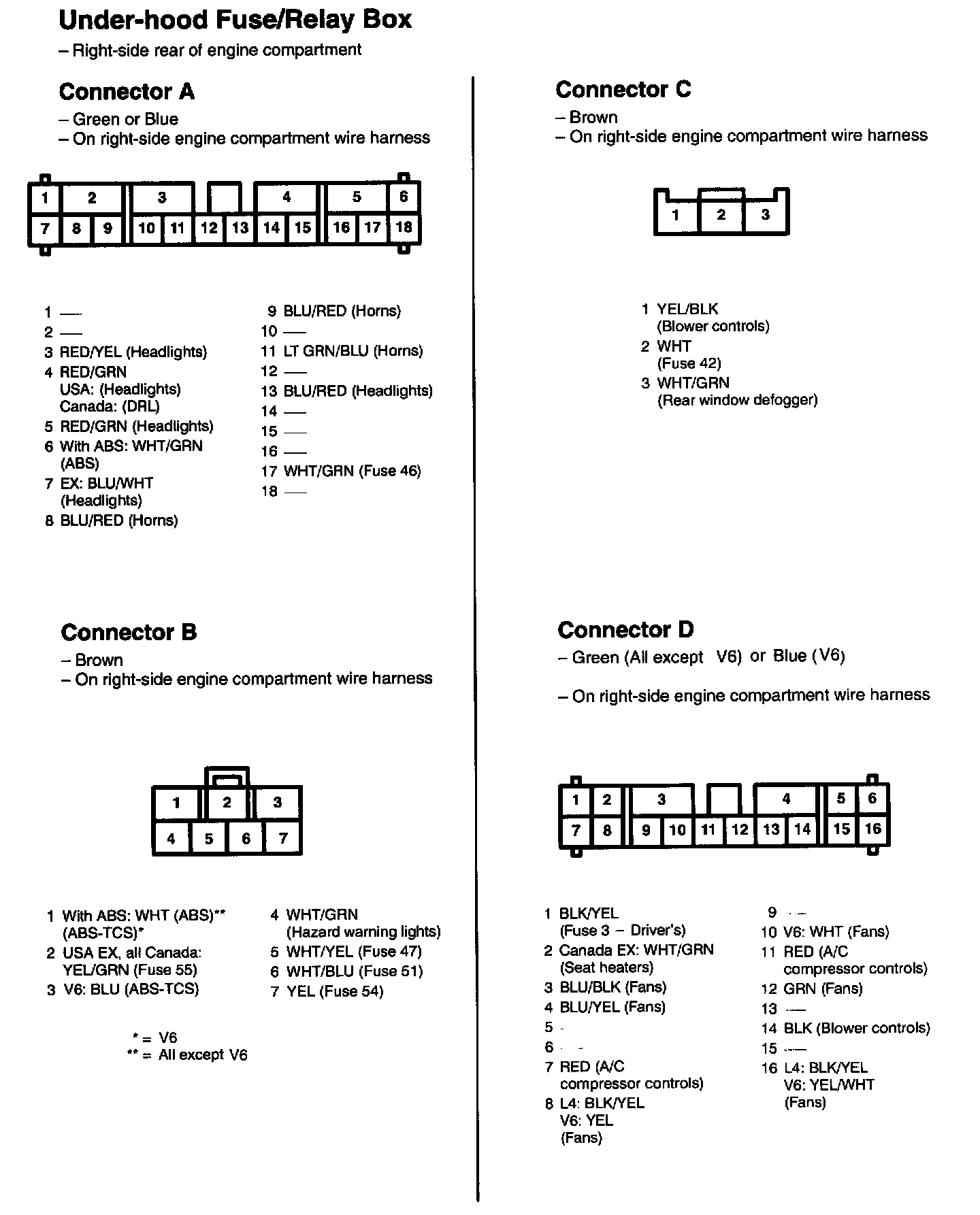 Under-Hood Fuse/Relay Box (Connectors A - D):