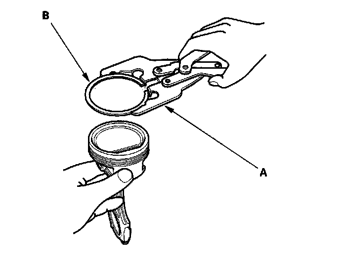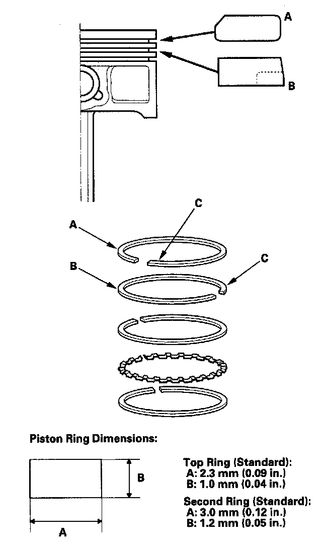 3. Measure the piston ring end-gap (B) with a feeler gauge: