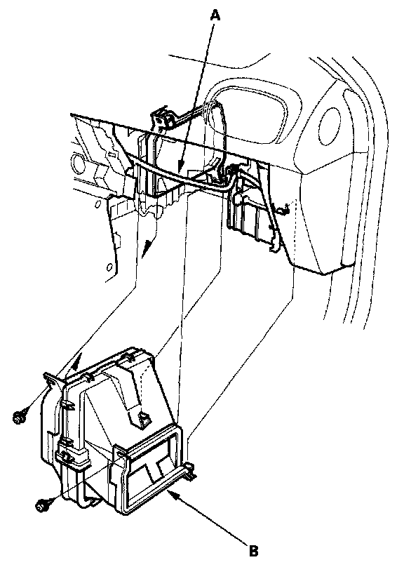 4. Remove the wire harness (A) from the heater duct (B), then remove the self-tapping screws and the heater duct.