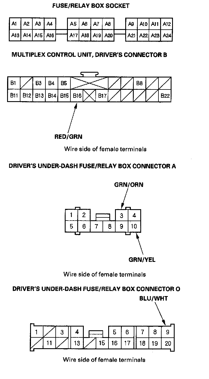 5. Reconnect the driver's multiplex control unit to the fuse/relay box, and perform the following input tests at the appropriate connectors on the back of the fuse/relay box.