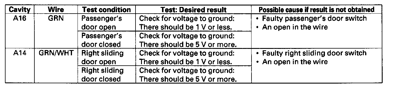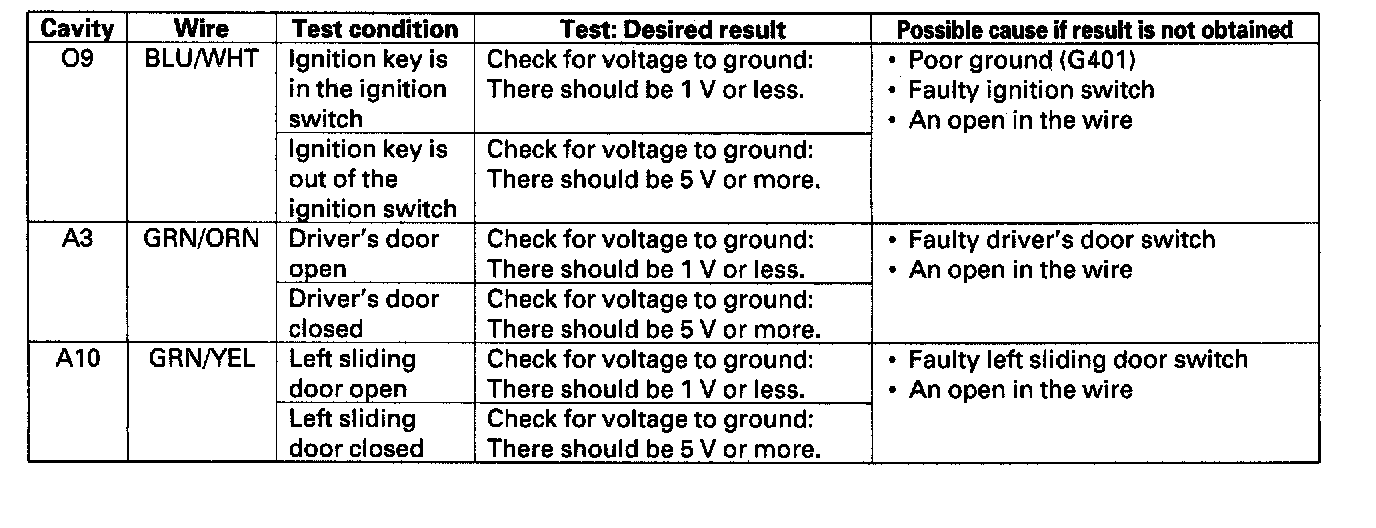 9. Reconnect the passenger's multiplex control unit to the fuse/relay box, and perform the following input tests at the appropriate connectors on the back of the fuse/relay box.