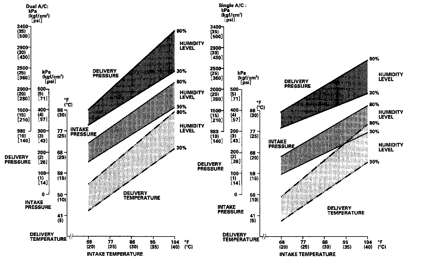 4. After running the air conditioning for 10 minutes under the above test conditions, read the delivery temperature from the thermometer in the dash vent, the intake temperature near the blower unit behind the glove box and the high and low system pressure from the A/C gauges.