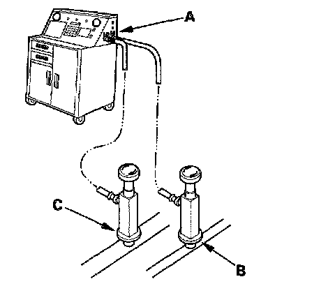 1. Connect a R-134a refrigerant recovery/recycling/charging station (A) to the high-pressure service port (B) and the low-pressure service port (C), as shown in the previous column, following the equipment manufacturer's instructions.