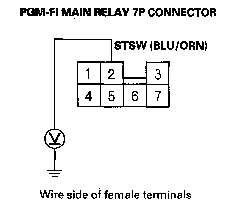 6. Turn the ignition switch ON (II), and measure voltage between body ground and the PGM-FI main relay 7P connector terminal No.5.