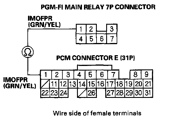 12. Check for continuity between the PGM-FI main relay 7P connector terminal No.1 and the PCM connector terminal E1.