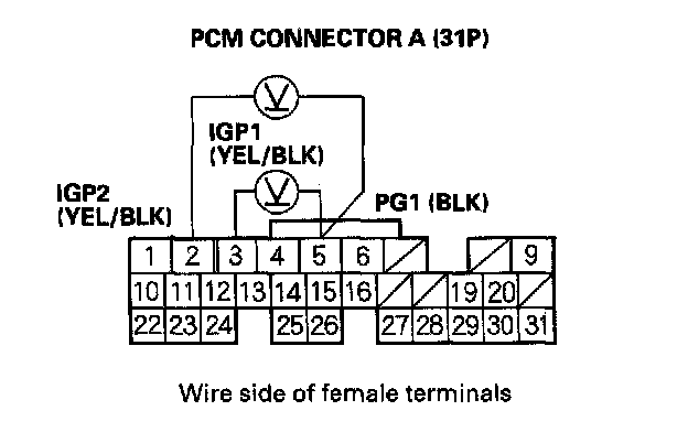 17. Measure voltage between PCM connector terminals A5 and E1 within the first 2 seconds after the ignition switch is turned ON (II).