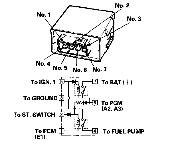 20. Connect battery power to the PGM-FI main relay 7P connector terminal No.5, and connect ground to the PGM-FI main relay 7P connector terminal No, 3. Then check for continuity between the PGM-FI main relay 7P connector terminals No.7 and No.6.