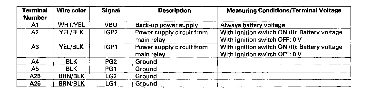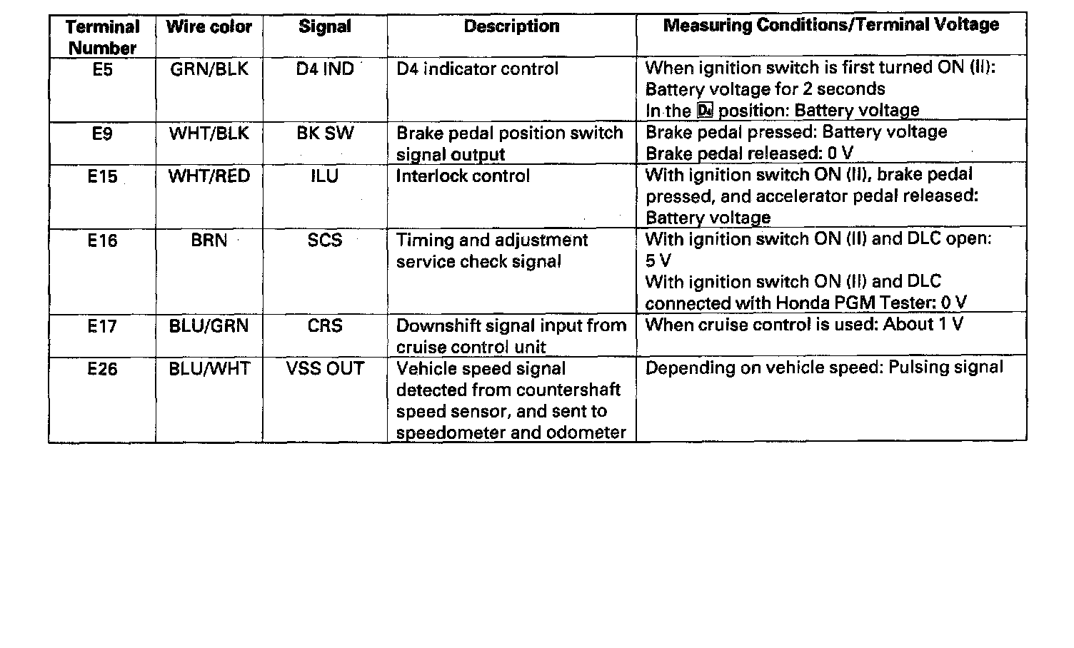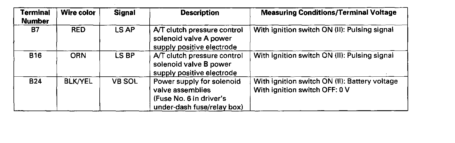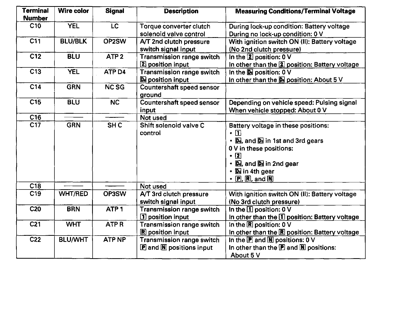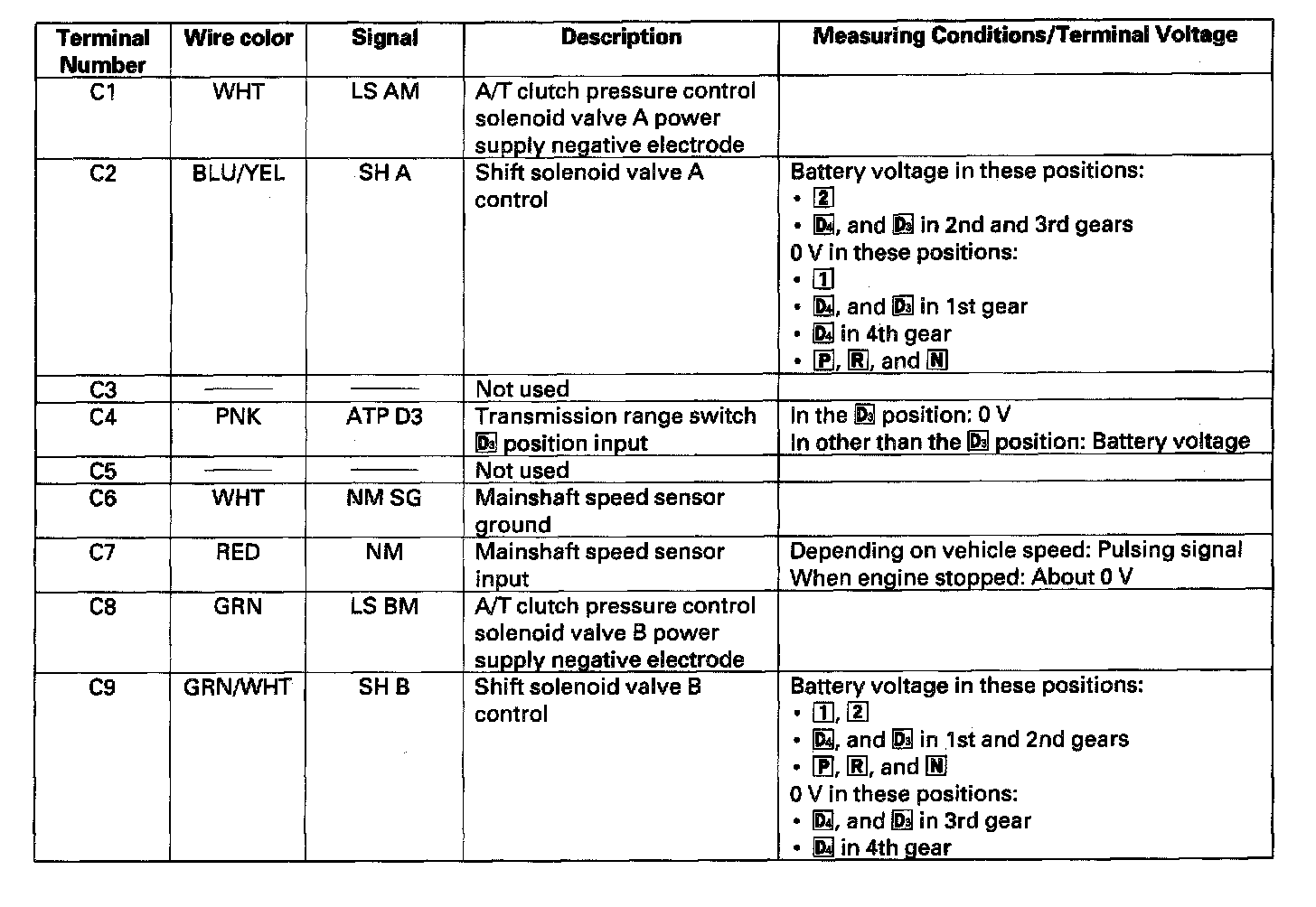 PCM Inputs and OutputsThe PCM terminal voltage and measuring conditions for the A/T control system are shown.