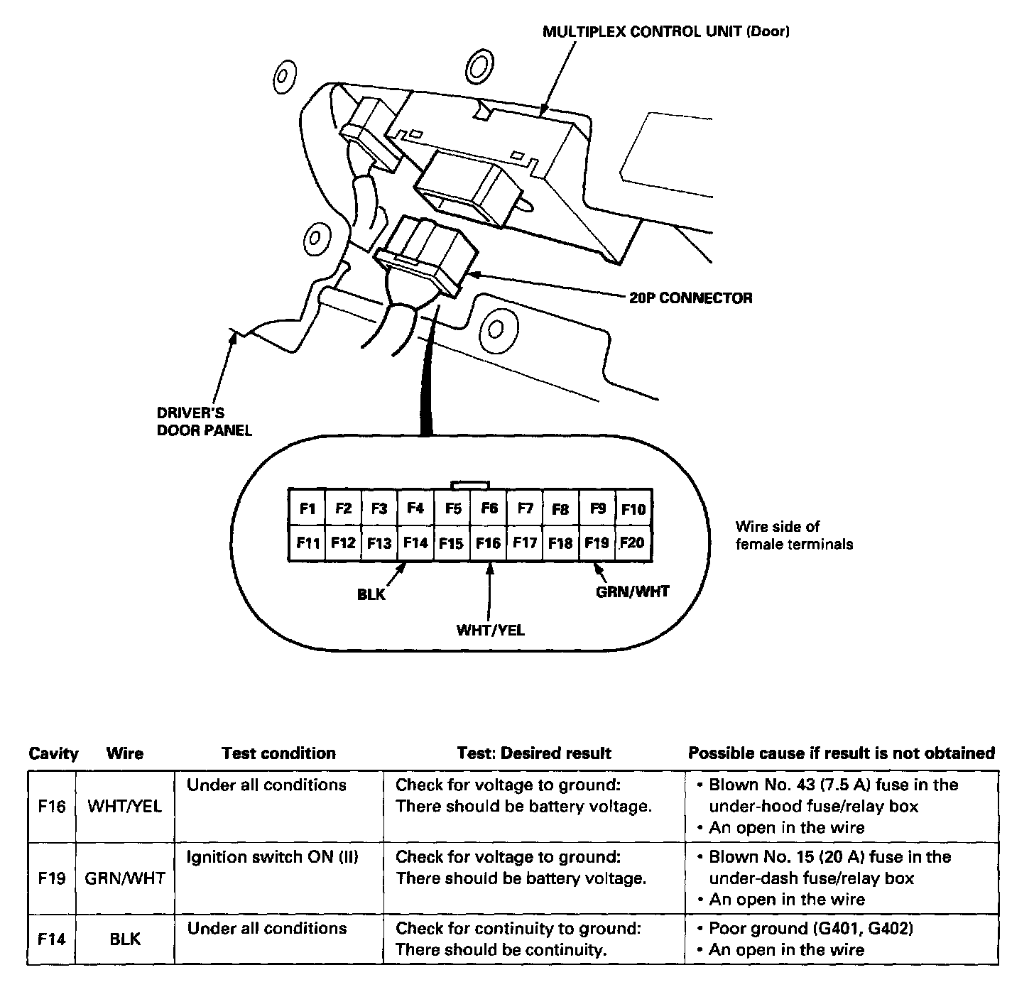 Multiplex Control Unit (Door):1. Remove the driver's door panel, and disconnect the 2OP connector from the door unit.