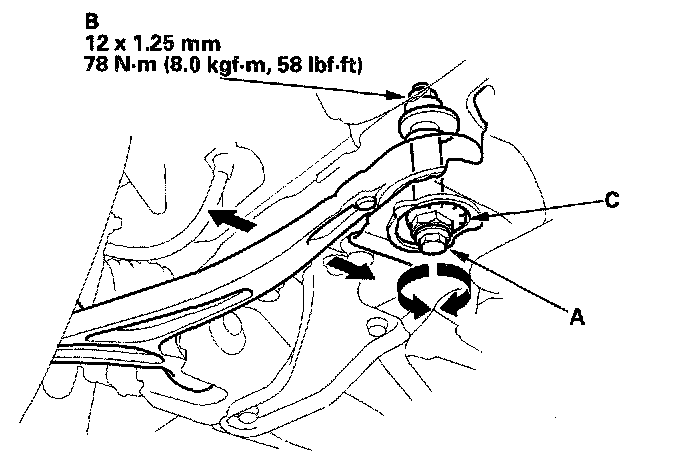 NOTE: Adjust the rear toe by adjusting the control arm and the lower arm by the same amount in opposite directions to each other (for example, when you move the control arm out, move the lower arm in, and vise versa).