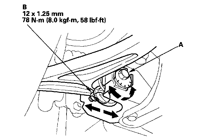 2. Hold the flange bolt (A) on the rear of the lower arm, and loosen the self-locking nut (B).