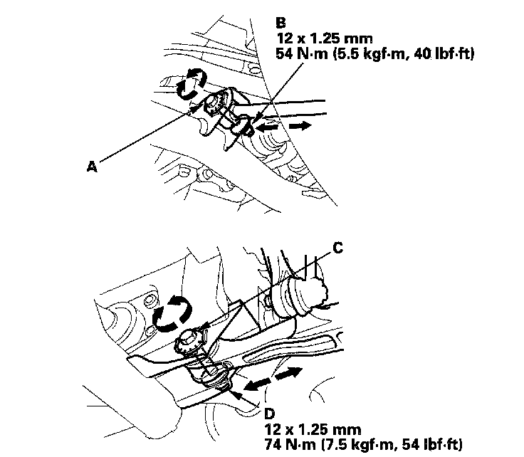 3. Hold the adjusting bolt of the control arm (A), and loosen the self-locking nut (B). Hold the adjusting bolt of the lower arm (C), and loosen the self-locking nut (D).